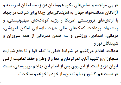 "در پی مراجعه و تماس‌های مکرر هم‌وطنان عزیز، مسلمانان غیرتمند و آزادگان عدالت‌خواه جهان به نمایندگی‌های ج.ا.ا برای شرکت در جهاد با ارتش‌های تروریستی آمریکا و رژیم کودک‌کش صهیونیستی، و پیشنهاد پرداخت کمک‌های مالی جهت بازسازی اماکن آموزشی، درمانی، امدادی، ورزشی و ...؛ ضمن قدردانی از همه سروران و شیفتگان نور و عدالت، اعلام می‌کنیم در شرایط فعلی با تمام قوا و تا دفع شرارت متجاوزان و تنبیه آنان، تمرکزمان بر دفاع از وطن و حفظ تمامیت ارضی ایران عزیز است. از این روی پس از اتمام این تهاجم تروریستی، دست در دست هم، کشور زیبا و تمدن‌ساز خود را خواهیم ساخت."
